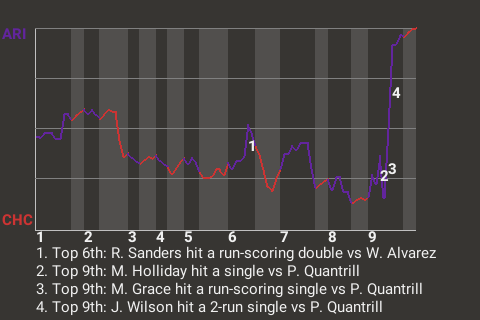 The game was at a stalemate until shortstop Jack Wilson came to bat in the top of the ninth. Facing Chicago pitcher Paul Quantrill, he hit a full count sinker for a 2-run single. It was a game-changer, putting Arizona on top, 5-3.